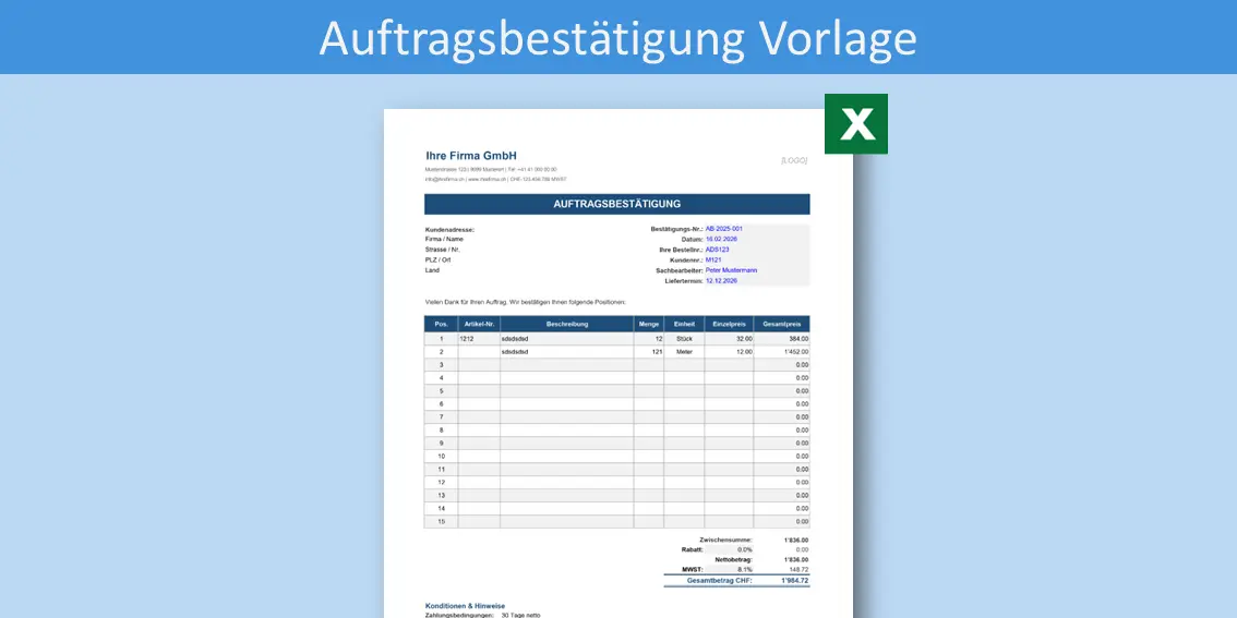 - Professionelle Auftragsbestätigung im Excel-Format